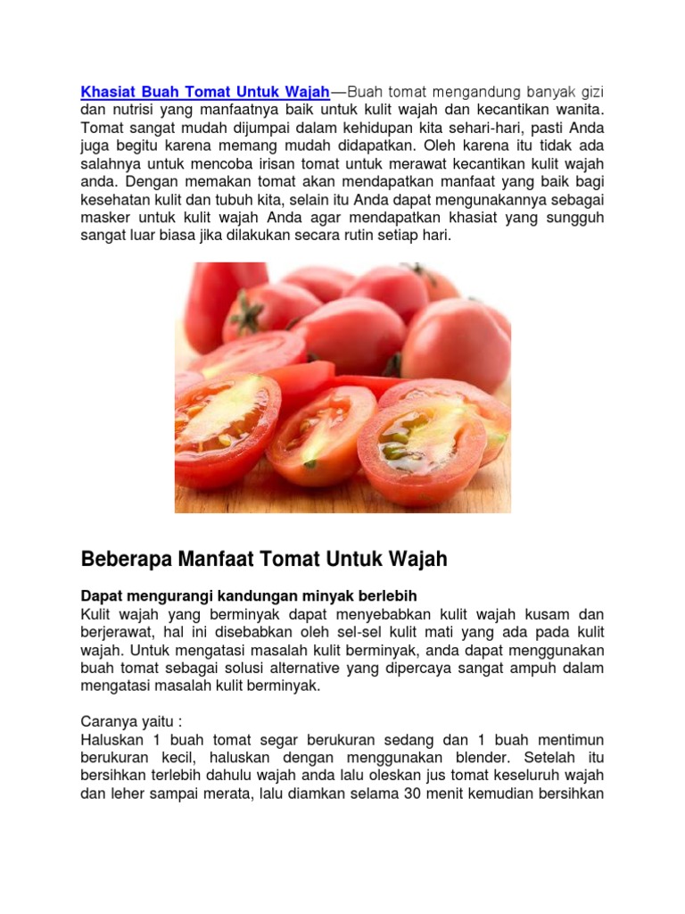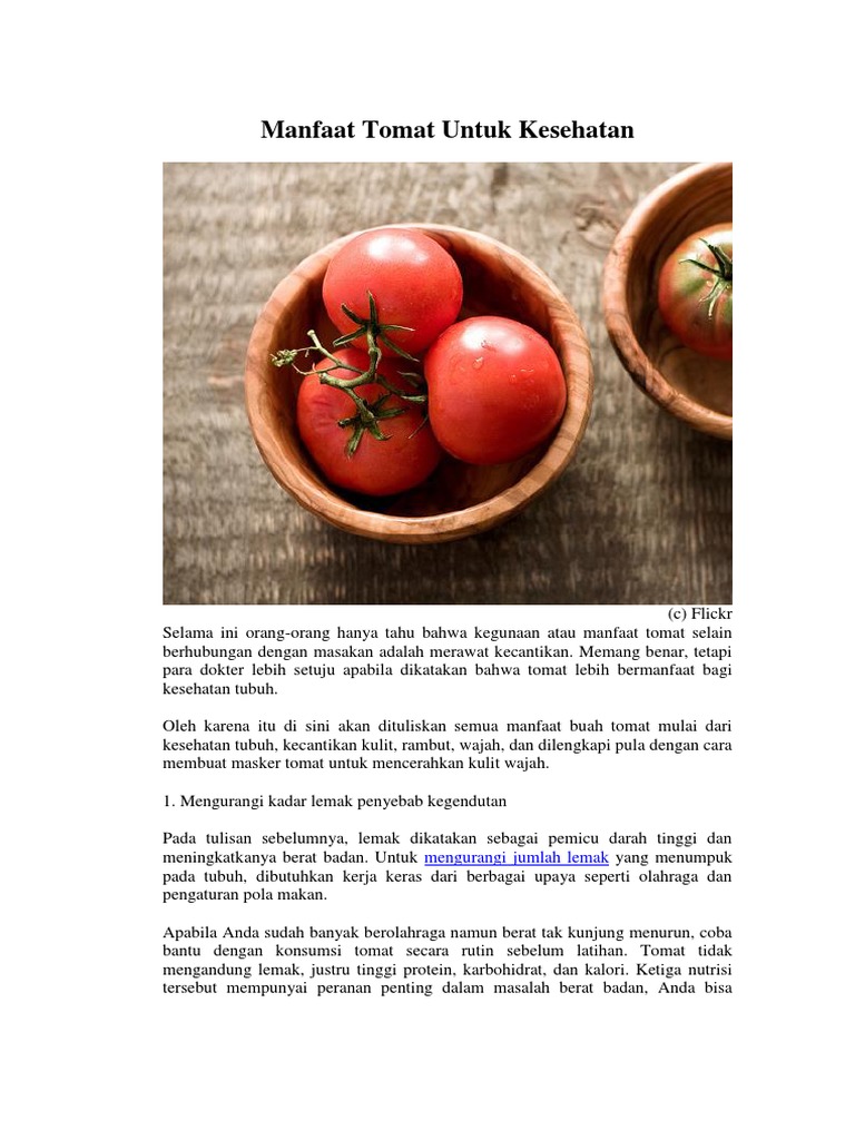 Manfaat Tomat Untuk Kesehatan from imgv2-2-f.scribdassets.com Penggunaan tomat untuk menyajikan aneka masakan membuat. 19 khasiat tomato yang anda perlu tahu. Kebaikan khasiat tomato untuk kulit sememangya diketahui ramai. Tomato mengandungi likopen (antioksidan) yang sangat berguna untuk melawan radikal bebas akibat asap kenderaan 2. Tomato juga mempunyai kandungan antioksidan seperti likopena dan zeazanthin dan berkesan mengecutkan jerawat pada muka dan menghalus atau mengecilkan liang. Betul ke tomato untuk cantikkan kulit ??!!_ part ii. Untuk mengantisipasi banyaknya minyak pada kulit wajah, cukup oleskan tomat yang telah diblender dan usapkan pada wajah. Untuk kulit, tomat lebih umu dijadikan krim alami yang terkadang dicampurkan dengan beberapa bahan alami lain seperti jeruk nipis, madu, gula, dan masih banyak lagi.